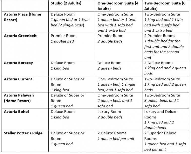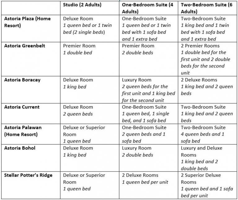 A: As a One-Bedroom Suite member, if you book in your home resort (Astoria Palawan or Astoria Plaza), we will provide you with a One-Bedroom Suite good for 4 guests. For other properties, we will provide you with a studio room, which can accommodate 4 guests as well.